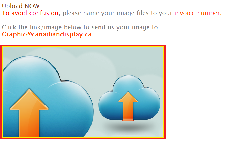 At the bottom of the page, click on the Upload Now Image. You will be redirected to a website to enter your email, your artwork, and our email(graphic@canadiandisplay.ca). Click transfer to send us your artwork!